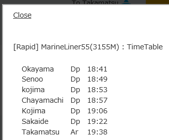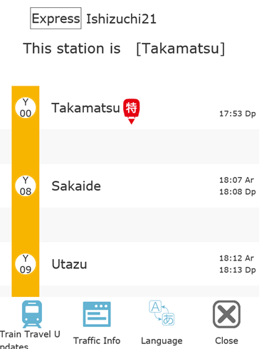 Station Info:The station information page of JR Shikoku is displayed. ※Display only if it exists on the JR Shikoku website TimeTable(PDF): Display the timetable of the station.